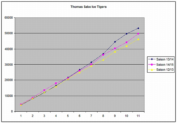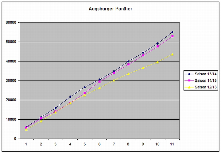 Einen leichten Aufwärtstrend weisen auch die Freezers auf. Der sportlich schwache Beginn und die anschließende Steigerung lässt sich recht einfach auch an der Zuschauerentwicklung nachvollziehen. Knappe fünf Prozent liegt man über der letzten Spielzeit.