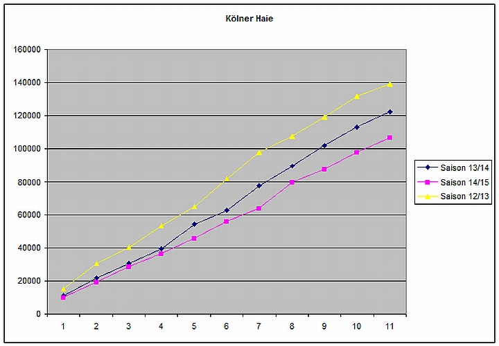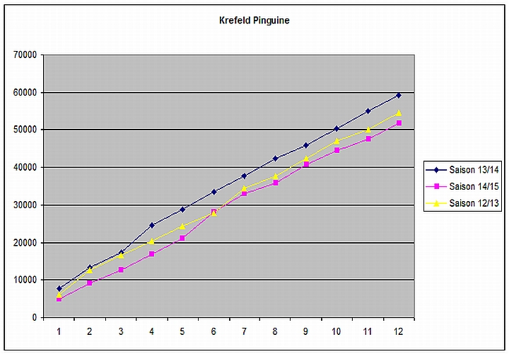In Krefeld ist der Zuschauerrückgang dagegen auf den ersten Blick im schmerzlichen Bereich. Ein Minus von über 12 Prozent hört sich aber schlimmer an als es tatsächlich ist. Da ist einfach noch kein Heimspiel gegen die Haie mit in der Rechnung. Dann wäre man wahrscheinlich auf dem Niveau der sportlich sehr erfolgreichen letzten Saison.