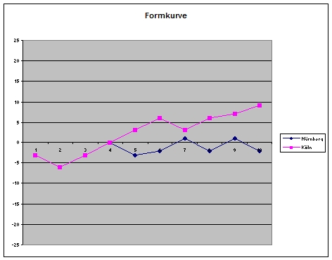 Der nächste Punkt ist die Normierung. Okay, nicht zuletzt auf Grund der Diskussion zum 22. Spieltag, aber die Argumente waren einfach auch schlüssig, bin ich gewillt, in dieser Hinsicht die Diagramme anzupassen. Ich hoffe nur, dass die Münchner nicht schon wieder gewinnen. Sonst muss ich die Skala auf 30 erweitern. Die Diagramme sollen schließlich nicht zu unförmig werden.