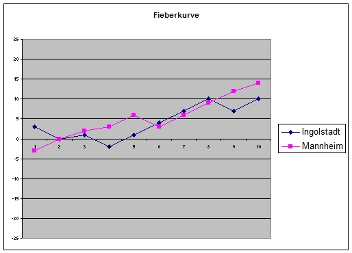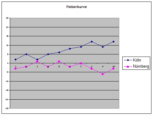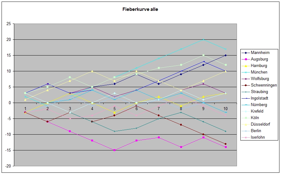 Im folgenden Diagramm habe ich mal die Fieberkurven aller Teams in einem Schaubild zusammengestellt. Danach wurde ja schon mal gefragt. (Hinweis: Auf die Grafik klicken, dann wird das Bild schärfer.)