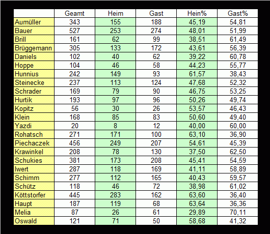Ein paar Extreme gibt es hier schon. Wertvoll könnte es sein, sich vorher anzuschauen, welche beiden Schiedsrichter man gerne auf GAR KEINEN FALL bei Heimspielen hätte, könnte ein gefährliche Mischung werden. Die kennen nämlich keinen Heimvorteil. Gilt natürlich auch umgekehrt. Und Melia mag keine Gäste. Ich wette, an Halloween verdunkelt der das Haus und stellt die Klingel ab.
