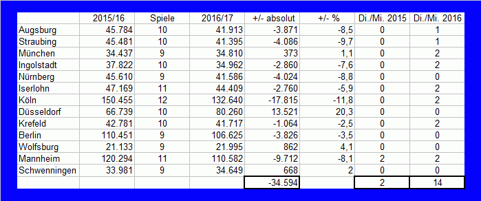 Einzig bei der DEG ist eine deutliche Steigerung zu erkennen, die nicht einfach mit dem Derby gegen die Haie zu erklären ist, denn ein solches hatte es auch in der Vorsaison zu diesem Zeitpunkt schon gegeben.