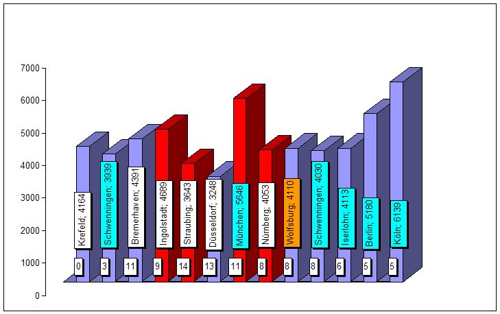 Die ist eine Grafik, die die meisten schon kennen müssten. Gegenübergestellt wird die Besucheranzahl aus der letzten Saison (rot) mit der aktuellen (gelb), die Zuschauerzahlen sind akkumuliert. Im Augenblick liegen alle Mannschaften zum Teil recht deutlich unter den Zahlen von letzter Saison, Ausnahmen sind Düsseldorf (nicht mehr lange), München und Wolfsburg (die alle drei knapp drüber liegen).