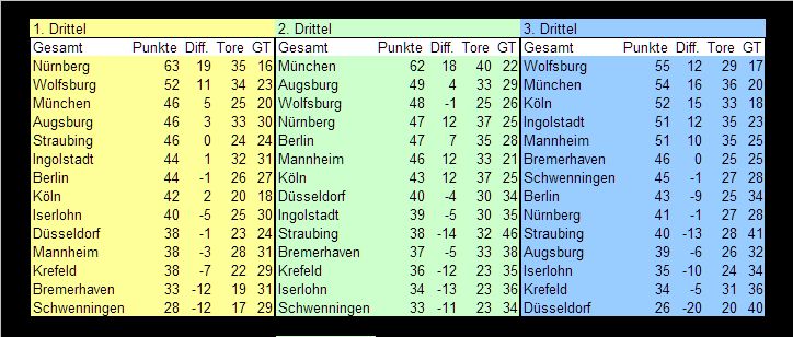 Ich möchte Ihre geschätzte Aufmerksamkeit bei der Drittelstatistik auf die Wahnsinnswerte von Nürnberg im ersten Drittel und München im zweiten lenken. Sowas lässt Gameplans vermuten. Und entlastet im Schlussabschnitt. Ich halte das letztendlich für kräftesparend.