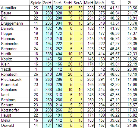 Die Tabelle hatte ich jetzt schon lange nicht mehr dabei, liegt vor allem daran, dass die Typen vor den Spielen weiter geheim bleiben. Kann sich jeder seinen Kandidaten raussuchen, die Tabelle ist soweit selbsterklärend. In der letzten Spalte werden die Strafminuten für Heimteams (H) und Gastteams (A) aufgelistet. Besondere Aufmerksamkeit verdienen die Spieldauer bei Bauer und die Diszis bei Piechaczek.