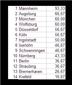 Der Unterschied in der Percentage-Tabelle ist schon berauschend (für Adler-Fans^^). Ob die 93,33 Prozent das höchste ist glaub ich nicht (Sowohl München als auch Nürnberg hatten glaub ich mehr), aber ich glaub der Abstand zum 2. war nie so groß.