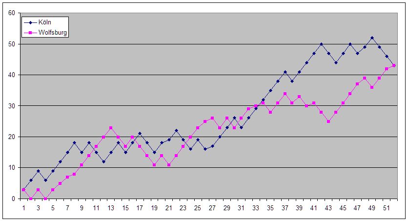 Frei nach dem Motto, offense wins pillepalle, defense wins championsships, kann es in dieser Saison eigentlich nur einen Meister geben. Aber das nur so nebenbei. Einen Schluss lassen die Hauptrundenduelle schon mal zu: Gewinnt Wolfsburg ein Spiel, dann nicht sehr hoch. Ein wenig kurios ist, dass es in der Hauptrunde nur Auswärtssiege gab.