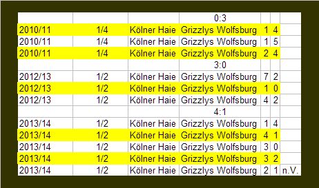 (In Gelb. Auswärtsspiel für das erstgenannte Team). Wolfsburg hat eine Serie gewonnen, die Haie zwei. 2010/11 ging es für die Grizzlys bis ins Finale, wo sie Berlin unterlagen. Wenn die Haie ihre Serie gewannen, landeten die ihrerseits im Finale und unterlagen (erst gegen Berlin, dann gegen Ingolstadt). Ergo: Der Sieger kommt ins Finale. Und dort verliert er. So einfach ist das, lang lebe die Statistik.