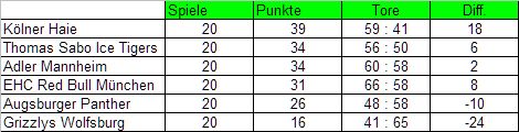 Neben den Grizzlys haben aus der Spitzengruppe nur die Adler gegen Köln eine ausgeglichene Bilanz. Vielleicht tue ich den Haien an dieser Stelle ein wenig unrecht, aber in der Schlussphase der Hauptrunde konnte ich ihre Ergebnisse zum Teil nicht mehr ganz ernst nehmen. Ein bloßer Blick auf die Ergebnisse, und ich dachte manchmal, die warten doch nur noch, bis die Playoffs losgehen. Zu Saisonbeginn zeigten die Haie zum Teil berauschendes Eishockey. Aber ihre wirklich beeindruckende Phase kam nach der 0:6-Niederlage gegen Bremerhaven. Und dabei meine vor allem die Spiele gegen die Teams aus der Spitzengruppe, deren Zusammensetzung seit dem 28.12. unverändert blieb, kurz danach setzte sich das Spitzenquartett ab.