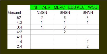 Das ganze ist wieder aus der Perspektive der Heimmannschaften gesehen. Beispiel: In der Serie Nürnberg vs. Augsburg verlor Nürnberg das erste Spiel, siegte zweimal und unterlag dann wieder in Spiel 4. In der DEL gab es das bisher zweimal, beide Serien gingen über die volle Distanz. Einmal gewann die Mannschaft mit Heimvorteil, einmal die ohne.