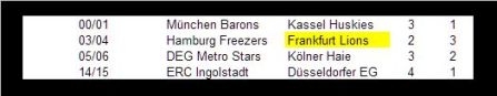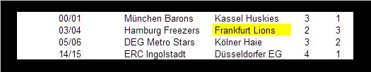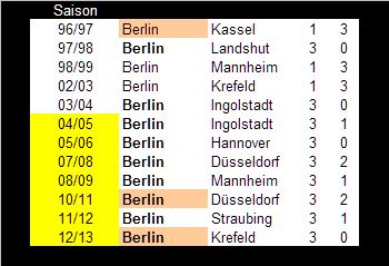 Now, the Eisbären. Das ist in der Tat beeindruckend. Bei den ersten fünf Anläufen scheiterten sie zwar dreimal, ABER: seit 2004/05 gewannen sie nicht nur ALLE Halbfinalserien, sondern wurde im Anschluss dann auch gleich Meister. Immer. Seit 2003/04 hat Berlin keine Halbfinalserie mehr verloren. Die letzte Teilnahme liegt schon eine Weile zurück. Im Best-of-Seven-Modus waren die Berliner noch nie dabei.