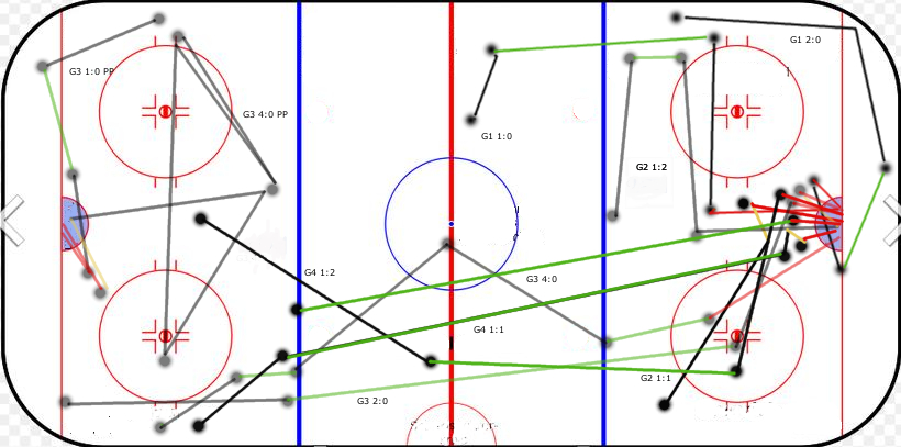 Als Abschluss der Vorschau ein kleines Experiment, müsst ihr selber entscheiden, ob man da etwas mit anfangen kann. Ich habe hier bis auf den Emptynetter von Steve Pinizotto (beim 3:1), den Shorthander von Brooks Macek (beim 5:1) und das letzte Powerplaytor der Serie durch Michi Wolf alle Tor der Serie gegen Berlin eingezeichnet.