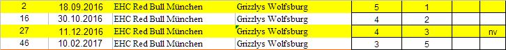 Die Hauptrundenspiele (Gelb: Gastmannschaft zuerst genannt): In der Hauptrunde hat München beide Spiele in Wolfsburg gewonnen, dazu das erste Heimspiel. Wie immer wieder angeführt, hatten die Grizzlys aus der Riege der Top-8 die schlechteste Bilanz aus Spitzenspielen, in einer Tabelle, die nur die Spiele der Spitzenteams untereinander wertete, landeten weit abgeschlagen auf dem letzten Platz. Jetzt stehen sie im Finale.