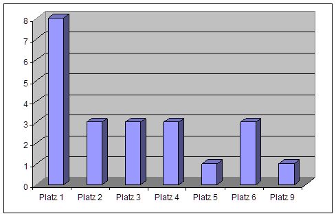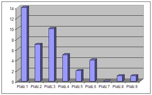 Welche Hauptundenplatzierung reicht wie häufig zum Titel? Platz 1 schaffte es 8 von 14 Mal, was einer Erfolgsquote von 57 Prozent entspricht. Platz 5 hat immerhin eine Ausbeute von 100 Prozent.