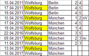Hier alle Finalspiele der Grizzlys seit Anbeginn der Zeit. So oft so nah dran, und dennoch hat es nie zu einem Sieg gereicht. Das nimmt langsam tragische Züge an. (Gelb: Wolfsburg auswärts)