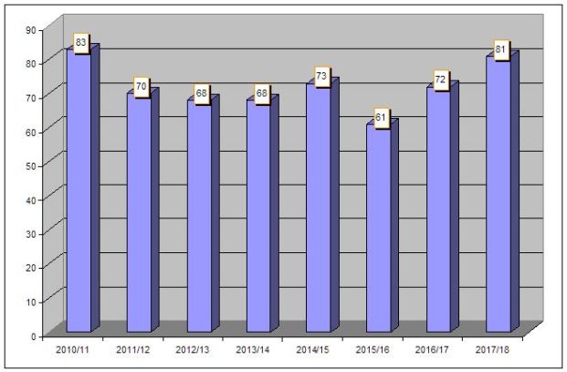 Es ist gar nicht so einfach, für den ersten Spieltag eine Grafik zu finden, aber clever wie ich bin, bin ich doch auf ein Thema gestoßen. Das Stichwort, das wir in diesem Falle suchen lautet „Spieltagsentzerrung“. Klingt so positiv wie „Freisetzung“ bei Entlassungen. In der Konsequenz bedeutet dies, dass in der Spielzeit 2017/18 Hauptrundenspiele an 81 Terminen angesetzt sind. Neun Termine mehr als in der letzten Saison. Angesichts der Tatsache, dass praktisch der gesamte Februar für Olympia draufgeht (gespielt wird in diesem Monat nur am 1.2., 2.2. und 28.2.), ist die Steigerung gewaltig. Wie der Grafik zu entnehmen ist, gab es zuletzt in der Spielzeit 2010/11 mehr Hauptrundenspieltage, damals lief die Saison allerdings auch über 60 Spieltage (bei 14 Teams). Einen wesentlichen Beitrag dazu leisten die zurückgekehrten Donnerstagsspiele – wie einst zu Premiere-Zeiten.