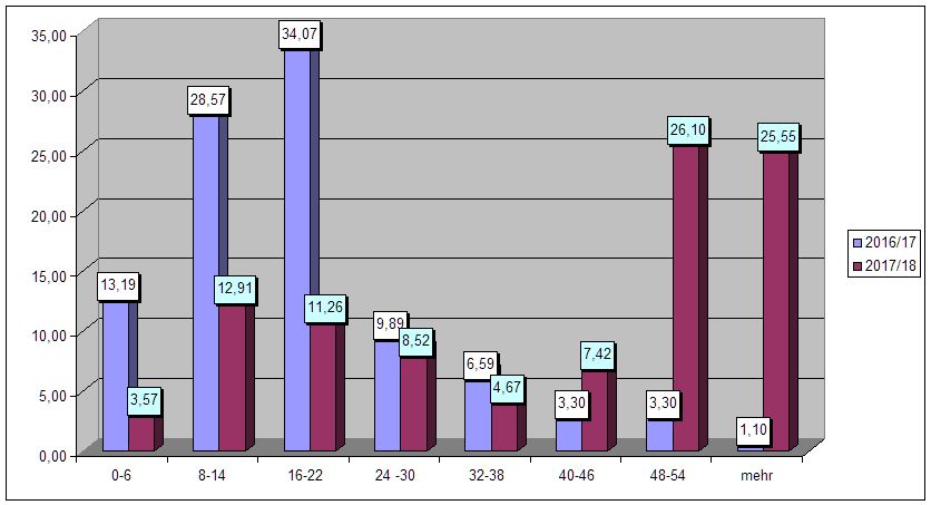 Dazu ein Blick auf das folgende Diagramm. Aufgezeigt wird, wie häufig Spiele in bestimmte Kategorien fielen. Die Kategorien sind die folgenden: Spiele mit 0-6 Strafminuten, 8-14, 16-22, 24-30, 32-38, 40-46, 48-54 und mehr. Und ja, es verändert sich etwas durch die neue Bewertung von „hoher Stock mit Verletzungsfolge“, aber das kann nicht die alleinige Erklärung sein. Beispiel Spalte 1: 13,19 Prozent der Spiele blieben unter acht Strafminuten in dieser Saison, letzte Saison waren es 3,57 usw. Die meisten Spiele in dieser Saison fallen in die Kategorie 16-22 Strafminuten, letzten Saison war es die Kategorie 48-54 Strafminuten, die überwog. Das ist ein gewaltiger Unterschied. Gibt’s die Ansage, die Spiele mehr laufen zu lassen? Diese Frage stelle ich mir schon. Ist natürlich reine Spekulation. Selbst wenn es in allen Spielen der Kategorie 16-22 5+20 für hohen Stock gegeben hätte, wäre der Unterschied immer noch vorhanden.