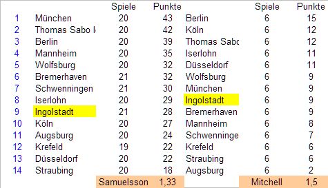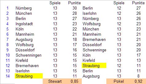 Letzter Fall Straubing. Da muss man schon sehr genau hinschauen, um eine Verbesserung zu erkennen. Die lässt sich vor allem auf das gerade zurückliegende 6-Punkte-Wochenende der Tigers zurückführen. Ohne dieses sähe die Bilanz unter Tom Pokel katastrophal aus (0,41). Vielleicht war es aber auch der Anfang vom Umschwung.