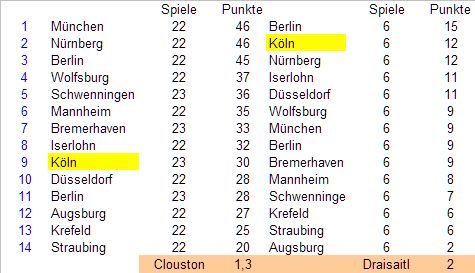Anders sieht es bei den Roosters aus. Die haben ihre Punktausbeute unter Rob Daum um mehr als 100 Prozent im Vergleich zu Jari Pasanen gesteigert. Und tatsächlich ist Daum mittlerweile schon so lange im Amt, dass die Roosters 20 Spiele in Folge, ab sofort, ohne Punkte bleiben müssten, damit der Schnitt von Daum unter den von Pasanen sinken würde. Das halte ich nach den Spielen, die die Sauerländer zuletzt gezeigt haben, für sehr, sehr unwahrscheinlich. Oder andersherum, wenn die Roosters ab sofort in allen restlichen Spielen ohne einen einzigen Punkt blieben, läge der Schnitt unter Daum am Ende der Saison bei 0,80, selbst das wäre nur leicht schlechter als unter Pasanen.