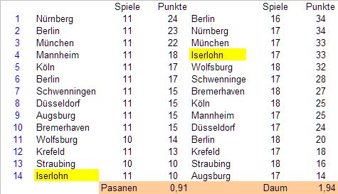 Anders sieht es bei den Roosters aus. Die haben ihre Punktausbeute unter Rob Daum um mehr als 100 Prozent im Vergleich zu Jari Pasanen gesteigert. Und tatsächlich ist Daum mittlerweile schon so lange im Amt, dass die Roosters 20 Spiele in Folge, ab sofort, ohne Punkte bleiben müssten, damit der Schnitt von Daum unter den von Pasanen sinken würde. Das halte ich nach den Spielen, die die Sauerländer zuletzt gezeigt haben, für sehr, sehr unwahrscheinlich. Oder andersherum, wenn die Roosters ab sofort in allen restlichen Spielen ohne einen einzigen Punkt blieben, läge der Schnitt unter Daum am Ende der Saison bei 0,80, selbst das wäre nur leicht schlechter als unter Pasanen.