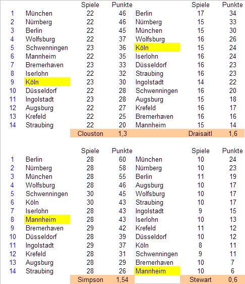Sowohl die Haie als auch die Adler starteten ins neue Jahr mit Niederlagen. Dabei kam die Heimpleite der Haie vielleicht einen Tick überraschender als die Niederlage der Adler beim Meister. Während das 0:1 der Haie gegen die DEG immerhin ahnen lässt, wie eng das Duell war, wird das 1:4 der Adler in München der Partie nicht ganz gerecht – Mannheim hielt gut dagegen, aber am Ende war der Meister doch eine Nummer zu groß. Die Haie haben ihre letzten drei Heimspiele verloren, blieben dabei zweimal ohne Tore – gegen München und die DEG. Die Adler haben die letzten neun Auswärtsspiele verloren. Zehn wären neuer Vereinsrekord. Bisher gab es in dieser Serie zwei Auswärtssiege: Mannheim gewann 1:0, Köln 6:2.