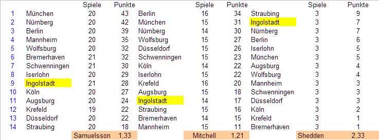 Das Problem beim ERC ist ganz einfach, dass das Sample noch verdammt klein ist, Shedden ist gerade einmal seit drei Spielen dabei. Kurioserweise hat er vor allem die Tigers stärker gemacht, muss seine Ausstrahlung sein, die über die Stadtgrenzen hinwegleuchtet, ganze Regionen erhellt. Dem Neu-Coach der Schanzer muss man noch vier, fünf Spiele geben, bevor man eine gültige Aussage bezüglich seines Impacts treffen kann.