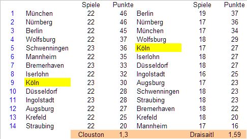 Bei den Haien geht es zwar seit dem Trainerwechsel aufwärts, aber eine Leistungsexplosion lässt sich bei der Punktausbeute unter Peter Draisaitl noch nicht unbedingt erkennen (Unter Cory Clouston 1,3 Punkte pro Spiel, unter Draisaitl 1,59). Köln hat drei der letzten vier Spiele verloren, blieb dabei gegen die DEG und Wolfsburg jeweils ohne Treffer. Mit dem Heimsieg zuletzt gegen die Adler beendeten sie eine Serie von drei Heimniederlagen.