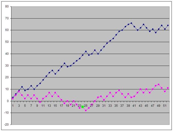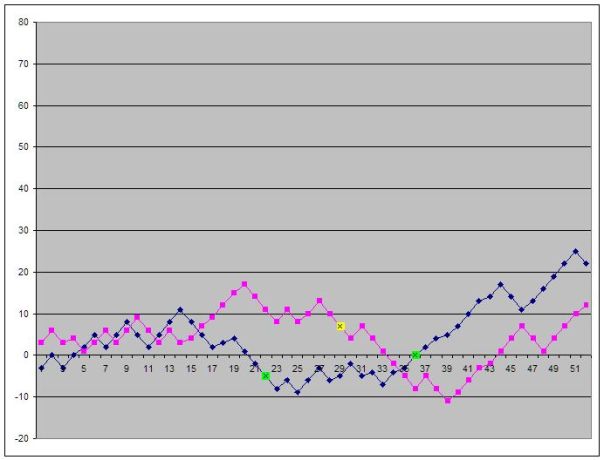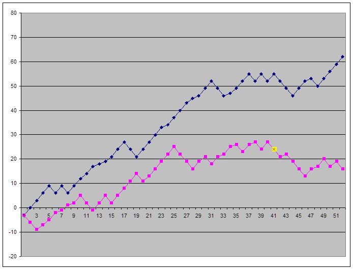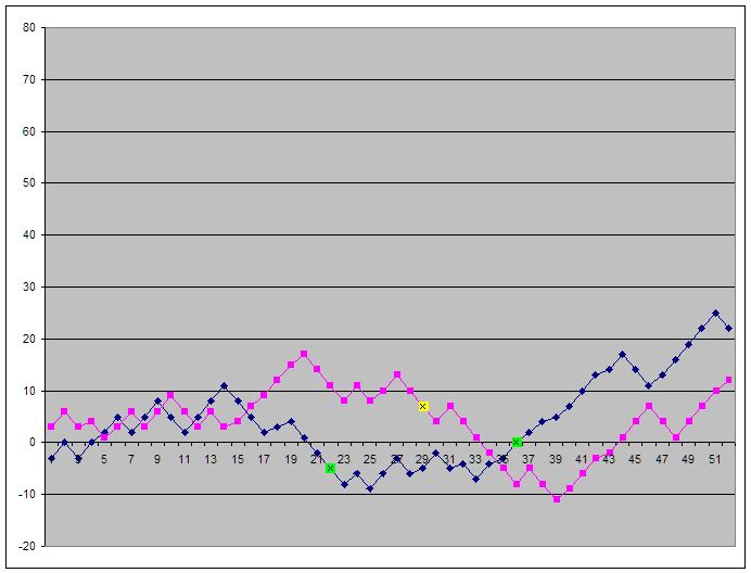 Zum Saisonverlauf der beiden Mannschaften. Beim ERC grün, bei Mannheim gelb gekennzeichnet, der Zeitpunkt des Trainerwechsels, sprich, das erste Spiel unter neuer Leitung. Die Saison der Adler, sie war keine gute. Es ist bereits genug darüber geschrieben worden, die Folgen sind bekannt: Bill Stewart übernahm nach 28 Spielen von Sean Simpson, von Anfang an war Stewart als Übergangslösung gedacht, als Platzhalter, wie sich bald herausstellte, für Pavel Gross. Es gibt also Argumente, die dafür sprächen, Stewart von Anfang an als lahmendes Pferd zu bezeichnen. Die Adler-Saison war von fürchterlichem Verletzungspech geprägt, was dazu führte, dass am Ende der Saison insgesamt 32 Spieler Einsätze bekamen! Stewart erwischt eine denkbar schlechten Start mit zwei Siegen aus den ersten zehn Spielen. Doch am Ende bekamen die Adler doch noch die Kurve. Die Form im Schlussspurt stieg steil nach oben, auf Grund des sehr engen Mittelfelds schafften es die Adler tatsächlich noch, sich direkt für das Viertelfinale zu qualifizieren. Danach hatte es lange Zeit nicht ausgesehen.