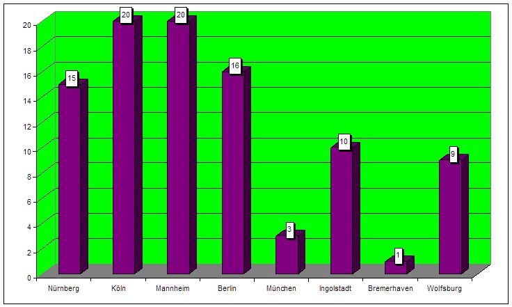 Die meisten Teilnahmen können Köln und Mannheim für sich verbuchen, bis die eingeholt bzw. überholt werden, wird noch verdammt viel Zeit ins Land gehen.