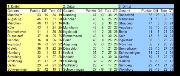 Nach längerer Zeit mal wieder der Blick auf die Drittelstatistik, umso interessanter, da sich seit dem letzten Mal ein bisschen was geändert hat. Damals waren es nämlich die Adler, die in (fast) allen Kategorien ganz vorne lagen.