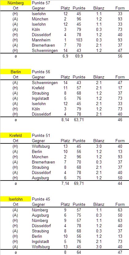 Zunächst ein Blick auf die Formkurve aus den letzten zehn Spielen. An der Spitze stehen im Gleichschritt Mannheim und München, die Platzierung ist einzig alphabetisch bedingt. Wir sehen aber auch: Unter den Team, die für die Preplayoffplätze neun und zehn in Frage kommen, finden wir mit Iserlohn, Krefeld und Berlin gleich drei Kandidaten. Das heißt, unmittelbar vor der Länderspielpause lief es bei allen drei Teams richtig mies.