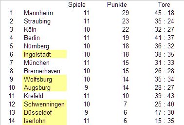 Zunächst ein Blick auf die Tabelle nach der Länderspielpause. Es gibt eindeutige Sieger und Verlierer, wobei es sich empfiehlt, diese Tabelle gerade im Hinblick auf den AEV mit etwas Vorsicht zu genießen. Mit den zwei Spielen, die ihm fehlen wäre da noch ein ganz schön großer Satz drin.